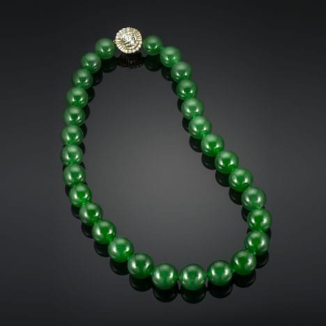 Chiếc vòng cổ 29 hạt Jadeit ( ngọc phỉ thúy) từ 14 đến 16,6mm và khóa kim cương 2,34 ct Ảnh của Robert Weldon, © GIA,Được sự ủy quyền của Công ty TNHH On Tung, Hồng Kông.Với sự giàu có ngày càng tăng của Trung Quốc, nhu cầu và giá ngọc Jadeit ( Phỉ Thúy) cũng đã ngày càng gia tăng. Ngoài vẻ đẹp, độ quý hiếm, ngọc Jadeit ( Phỉ Thúy) còn được ưa chuộng bởi lịch sử lâu đời, với quan niệm truyền thống tin rằng ngọc Jadeit ( Phỉ Thúy) đem đến may mắn và tránh được xui rủi