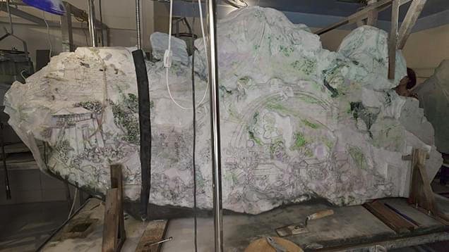 Vào tháng 6 năm 2013, một nhóm nhân viên của GIA đã đến thăm một trong số những trung tâm Jadeit ở miền nam Trung Quốc. Tại Sihui, các chuyên gia đã đã được gặp ông Zheng chủ tịch của Mazu Jade Articleco., Ltd và ông Fang , chủ tịch hội chạm khắc Jingyu Mantang Jadeit. Họ đã giới thiệu một khối nguyên thạch lớn mà họ đã đấu giá thành công tại Myanmar năm 2004. Bệ đá nặng khoảng tám tấn và được tách làm hai phần: một để tạo bức Shan Zi khổng lồ và phần còn lại được chia thành 3 phần chạm khắc ba vị thần phúc – lộc – thọ